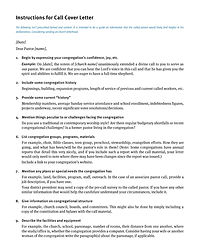 In two to four pages on church letterhead, the cover letter introduces your congregation, its ministry, and your community to the pastor-elect. It also provides details about compensation, moving support, and ministry reimbursements. It invites the pastor to reach out with questions and lists contact information for various people who will represent the congregation well. Since the letter speaks for the congregation, it should be shared with your congregation before the first call meeting together with invitation for feedback. Proofread it well and ensure it has a professional appearance.